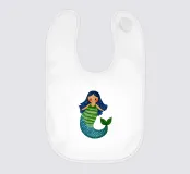 L'illustrazione mostra un'allegra sirena con lunghi e fluenti capelli blu, guance rosee e un ampio sorriso. La sua parte superiore ricorda le squame di un pesce e la sua pinna caudale è blu con accenti verdi. Lo stile è giocoso e infantile, con linee pulite e colori vivaci. La texture sullo sfondo conferisce all'immagine un tocco artigianale e affascinante.