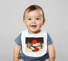 This geometric landscape showcases a dramatic sunset casting a warm glow over a majestic mountain range. The minimalist style emphasizes the bold shapes and vibrant colors, creating a visually striking and modern piece. The winding river adds a sense of depth and dynamism to the composition.