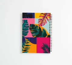 A sophisticated composition combines blocks of tropical leaf patterns with solid color fields and geometric shapes. The patchwork design in shades of blue, pink, and green creates a balanced and stylish piece that is both modern and natural.