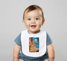 Una veduta prospettica di una strada europea stretta e tortuosa, fiancheggiata da edifici colorati, piante in vaso e diretta verso un cielo luminoso e nuvoloso.