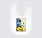Vibrant lemons are placed alongside blue and white ceramics against a background of textured blue tiles. The scene is illuminated with warm light, highlighting the rich yellow and blue tones.