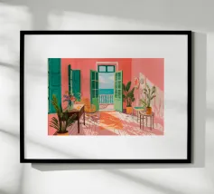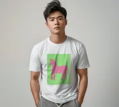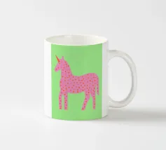 Questa giocosa illustrazione mostra un unicorno rosa con puntini su uno sfondo arancione e verde, perfetto per le camere dei bambini o per le decorazioni estive. La grafica dipinta a mano combina elementi fantasiosi con un design minimalista e crea un'atmosfera allegra che irradia gioia e creatività.