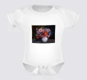 Una brocca bianca contiene un abbondante e traboccante bouquet di fiori in un tripudio di colori rosa, viola, rossi e gialli, dipinti in uno stile ricco, scuro e lunatico che sembra al tempo stesso classico ed espressivo.