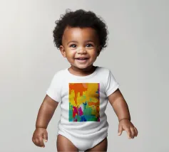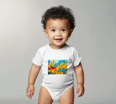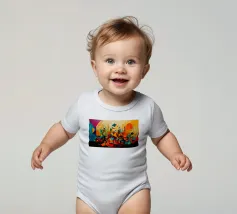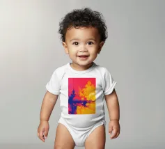Quadro astratto dinamico che presenta un'architettura surreale, vivaci toni arancioni e blu, alberi astratti e sfere fluttuanti in un paesaggio fantastico. I tratti strutturati e i contrasti decisi creano un'atmosfera onirica ed energica.