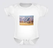 Maestose montagne innevate si ergono su una valle tranquilla e invernale; la luce nitida e la fresca tavolozza di bianchi, blu e gialli pallidi catturano la bellezza silenziosa e serena del paesaggio alpino.