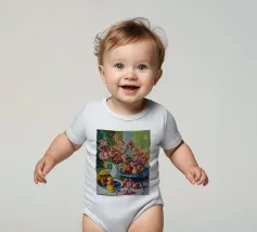 Un'audace natura morta con vivaci fiori rosso-rosa, forse papaveri o gerani, in un semplice vaso, accanto a fresche pere verdi, il tutto su una ricca tovaglia rossa che contrasta nettamente con uno sfondo blu intenso.