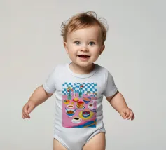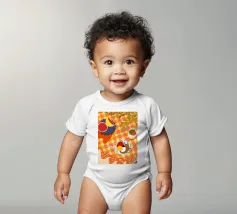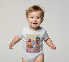 Illustrazione luminosa e allegra di un tavolo per la colazione illuminato dal sole, con caffè, succo d'arancia e pasticcini su un vivace sfondo giallo.