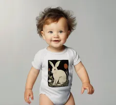 Due coniglietti pasquali stilizzati tra fiori colorati, pulcini e farfalle: un motivo allegro in stile poligonale, ideale per il periodo pasquale e l'inizio della primavera.