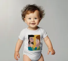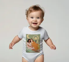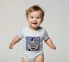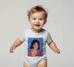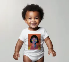 Questo dipinto raffigura una persona con i capelli neri che indossa un abito colorato con forme geometriche. Lo sfondo è rosso e la persona è adornata con grandi orecchini circolari.