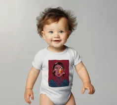 Questo dipinto raffigura una persona con i capelli scuri acconciati in due chignon, che indossa grandi orecchini arancioni. Il volto della persona è dipinto con audaci motivi rossi e bianchi, mentre lo sfondo è di colore rosso pieno.