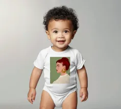 Questo dipinto raffigura una persona con i capelli scuri acconciati in due chignon, che indossa grandi orecchini arancioni. Il volto della persona è dipinto con audaci motivi rossi e bianchi, mentre lo sfondo è di colore rosso pieno.