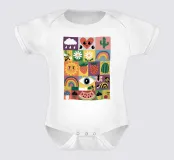 Un motivo allegro e giocoso di varie icone simpatiche e colorate, tra cui arcobaleni, cactus, occhi e frutta. Il mix eclettico crea un disegno divertente, energico e stravagante.