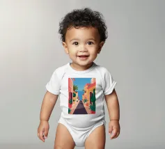 Una moderna natura morta astratta con una pianta stilizzata in un vaso blu, un croissant e forme organiche sotto un sole giallo, il tutto in una composizione equilibrata e calda.