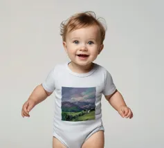 Un pittoresco paesaggio autunnale che raffigura un villaggio o una fattoria adagiata su una collina, circondata da un mosaico di alberi colorati nei toni dell'arancione e del giallo e da campi coltivati, con le lontane montagne blu a completare la scena.