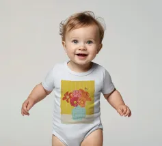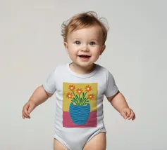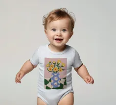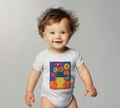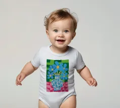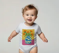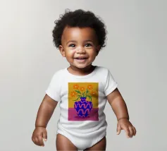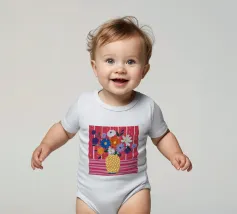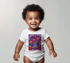 Un vaso a righe bianche e blu contiene fiori gialli e rosa, su uno sfondo vibrante, simile a una trapunta, con motivi floreali rosa, arancioni e rossi.