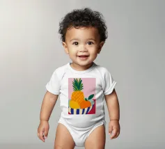 Una moderna natura morta di due pere gialle in una ciotola con un audace motivo a zig zag in bianco e nero. Lo sfondo a scacchi rosa e viola aggiunge un ulteriore livello di grafica giocosa alla composizione.