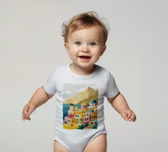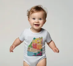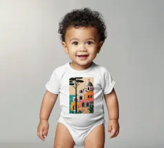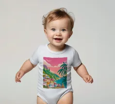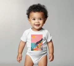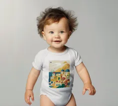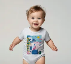 Una pittoresca illustrazione degli iconici edifici bianchi e delle cupole blu di un'isola greca, probabilmente Santorini, affacciata sul mare. La scena è una perfetta rappresentazione, inondata di sole, di un paradiso mediterraneo.