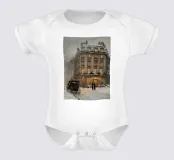 Un romantico paesaggio urbano dal sapore invernale: una carrozza nera trainata da cavalli si ferma nella neve fresca davanti a un magnifico edificio antico con finestre illuminate in modo caldo. Due persone elegantemente vestite sono impegnate in una conversazione, mentre i lampioni gettano una luce dorata sulla strada innevata. La scena racconta di un'epoca passata, dell'eleganza e della tranquilla bellezza di una serata innevata in città.