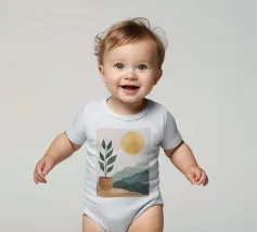 Una composizione minimalista presenta un vaso con una pianta verde davanti a una finestra ad arco, che mostra un paesaggio sereno con montagne, sole e lago in toni tenui. Le calde tonalità del marrone e del rosa creano un'atmosfera naturale e rilassante.