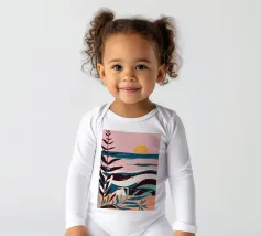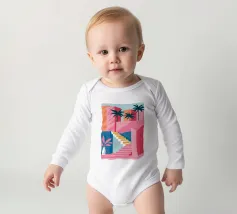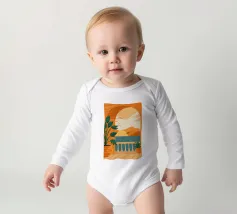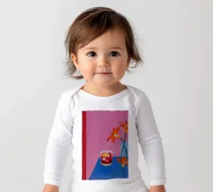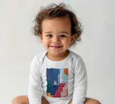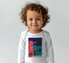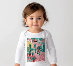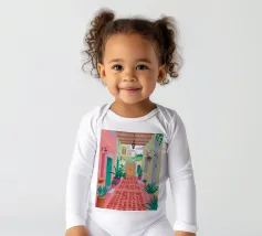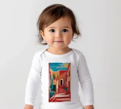 Scale rosse e vivaci conducono attraverso un edificio colorato e semplificato verso un lussureggiante ingresso ad arco, suggerendo un viaggio verso una destinazione bella ed esotica.