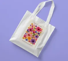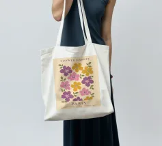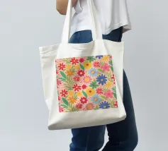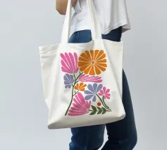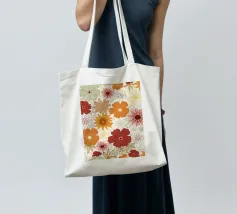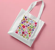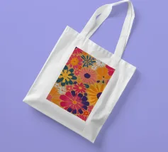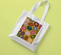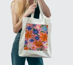 Un motivo floreale giocoso che sembra una passeggiata visiva in un festival di giardini retrò: I fiori stilizzati, nei colori arancione, rosa, viola, rosso e giallo, danzano liberamente. Ogni fiore ha una forma semplice, simile a una margherita, con lunghi petali a raggiera che emergono da un punto centrale. La disposizione è volutamente irregolare, come un disegno sparso di gioia, estate e nostalgia.