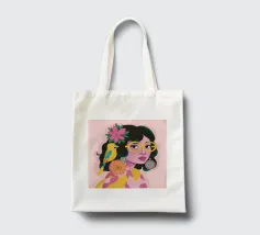 Questo dipinto ritrae una persona che indossa una camicia a righe gialle e bianche con grandi orecchini arancioni. Un piccolo uccello è appollaiato sulla spalla della persona, aggiungendo un elemento affascinante alla composizione.