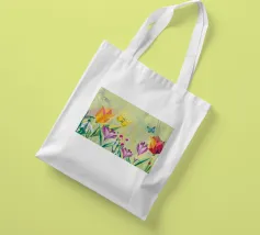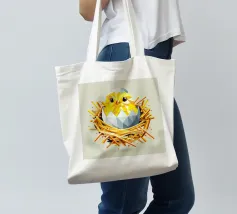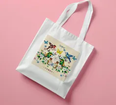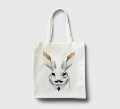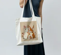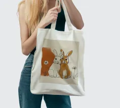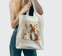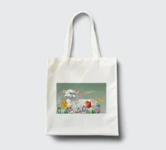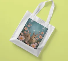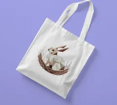Due coniglietti pasquali stilizzati tra fiori colorati, pulcini e farfalle: un motivo allegro in stile poligonale, ideale per il periodo pasquale e l'inizio della primavera.