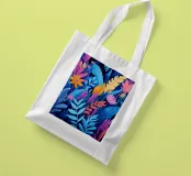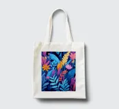 Un'accattivante illustrazione astratta della giungla, che combina foglie e fiori tropicali in vibranti tonalità di blu, rosa, arancio e giallo. Un disegno perfetto per aggiungere un tocco esotico e moderno alla vostra casa.