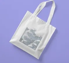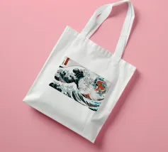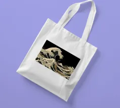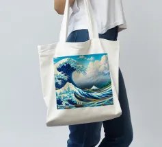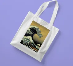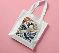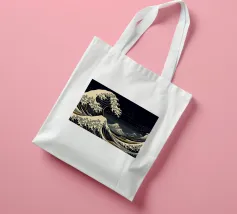 L'immagine raffigura un'illustrazione stilizzata in bianco e nero della Grande Onda al largo di Kanagawa, una famosa xilografia giapponese, con la Torre Eiffel sovrapposta all'onda. L'onda è raffigurata in un movimento dinamico e vorticoso, con creste spumeggianti e una base blu intenso. La Torre Eiffel si erge alta e slanciata, con la sua struttura intricata che contrasta con la forma organica dell'onda.