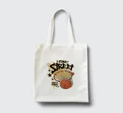 Design urbano del basket con tipografia graffiti, tavolozza arancione e nera e canestro in rete. Uno stile street distintivo per abbigliamento sportivo e casual.