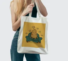 Un personaggio a forma di patata dei cartoni animati che indossa un maglione rosso si adagia comodamente su un divano viola, con una didascalia ironica: "Non sono un patata da divano, sono solo in modalità risparmio energetico".