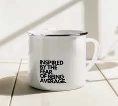 "La frase "INSPIRED BY THE FEAR OF BEING AVERAGE!", impilata su più righe e resa con un carattere sans-serif nero in grassetto su uno sfondo bianco pieno, trasmette un messaggio di ambizione e di spinta a eccellere",