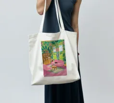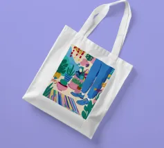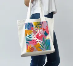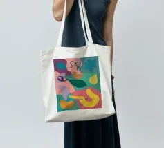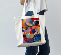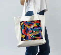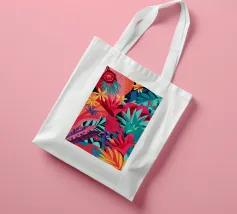 Una composizione astratta presenta una ciotola di fragole in mezzo a un turbinio di forme e motivi organici e colorati, creando un'interpretazione fresca e moderna di un classico dell'estate.