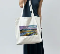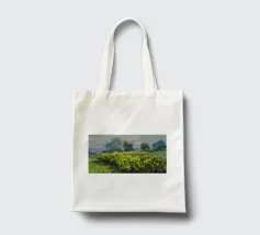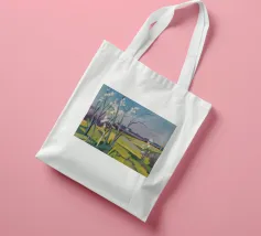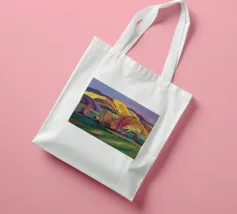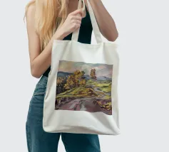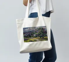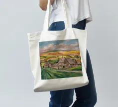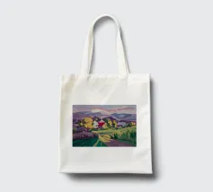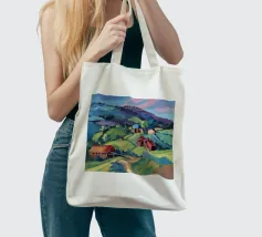 Un pittoresco paesaggio autunnale che raffigura un villaggio o una fattoria adagiata su una collina, circondata da un mosaico di alberi colorati nei toni dell'arancione e del giallo e da campi coltivati, con le lontane montagne blu a completare la scena.