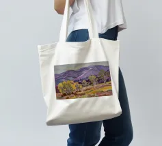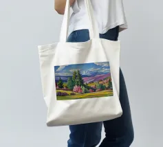 Un pittoresco paesaggio autunnale che raffigura un villaggio o una fattoria adagiata su una collina, circondata da un mosaico di alberi colorati nei toni dell'arancione e del giallo e da campi coltivati, con le lontane montagne blu a completare la scena.