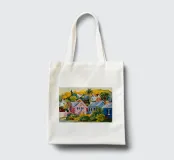 Un villaggio di case colorate di rosa, blu e giallo è adagiato sul fianco di una collina; la scena è composta come un'allegra trapunta patchwork di colori e forme, che emana un senso di comunità e gioia.