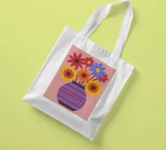Un vaso a righe bianche e blu contiene fiori gialli e rosa, su uno sfondo vibrante, simile a una trapunta, con motivi floreali rosa, arancioni e rossi.