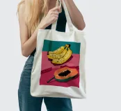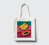 Un'illustrazione audace e ispirata alla pop art di banane e papaya su un piatto rosso brillante. I colori ad alto contrasto e lo stile grafico creano una dichiarazione vibrante e giocosa.