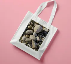 Rocce di varie forme e dimensioni sono adagiate su una spiaggia, con un'attenzione particolare a una pietra unica e strutturata. L'ambiente appare tranquillo, con la luce del crepuscolo che mette in risalto il paesaggio naturale.