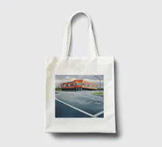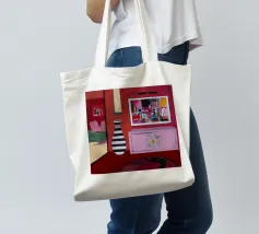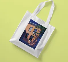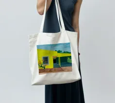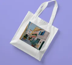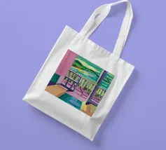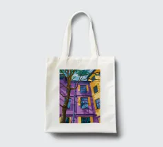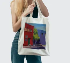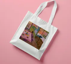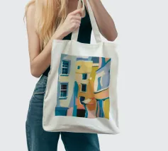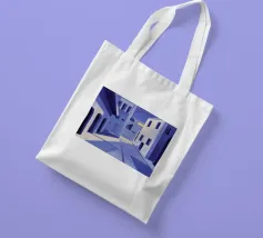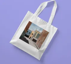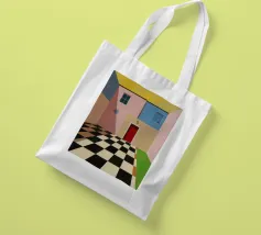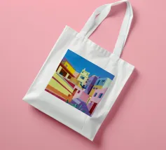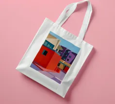Una complessa scena urbana è resa con un'attenzione particolare alle forme geometriche e a un'audace tavolozza di colori rosa, verde acqua e rosso. Una scala esterna fornisce un forte elemento compositivo, guidando l'occhio attraverso le forme architettoniche astratte.
