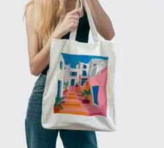 Quest'opera d'arte cattura la bellezza iconica di un'isola greca con i suoi gradini vivaci e colorati nei toni del rosa, dell'arancione e del rosso. La classica architettura bianca e blu incornicia la scena, creando un'immagine gioiosa e pittoresca che trasporta immediatamente in un vicolo soleggiato di Santorini.