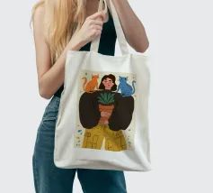 Una scena d'interni stravagante e astratta con una scala rosa, piante in vaso e un sole e una luna nel cielo visti attraverso un arco. L'opera d'arte è un paesaggio da sogno giocoso e bohémien.