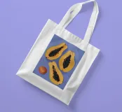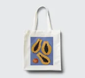 Una natura morta semplice ed elegante di una papaya tagliata a metà su un piatto blu intenso. La composizione minimalista e il sorprendente contrasto cromatico tra il frutto arancione e il piatto blu creano un pezzo moderno e sofisticato.
