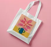 Un'illustrazione semplice ma d'effetto di una pianta dalle foglie rosa in un audace vaso blu su uno sfondo caldo, che celebra la bellezza del colore e della forma botanica minimalista.