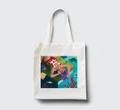 Una persona con cuffia e occhialini retrรฒ galleggia tranquillamente nell'acqua turchese, circondata da pesci colorati e piante acquatiche, creando una scena subacquea serena e onirica.