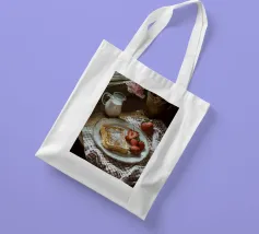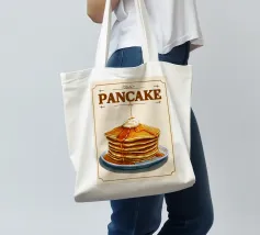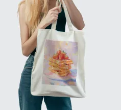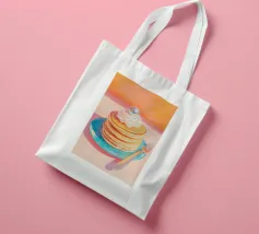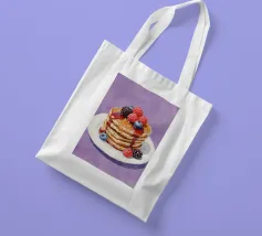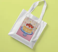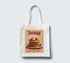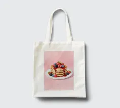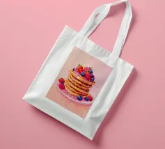 Una pila di pancake è sormontata da fragole e irrorata di sciroppo, su uno sfondo a scacchi bianchi e rosa. I colori vivaci e lo sciroppo lucido creano un aspetto invitante.