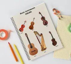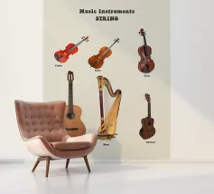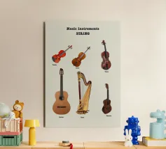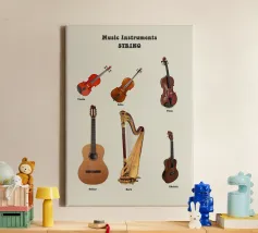 Esplora la bellezza degli strumenti a corda con questa dettagliata tabella didattica che presenta violino, violoncello, viola, chitarra, arpa e ukulele.