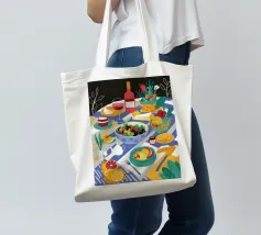 Vista dall'alto di un'insalata di pomodori freschi e di un bicchiere di vino su una tovaglia verde a righe all'aperto. La luce del sole e le ombre lunghe creano una scena vibrante, fresca e bella di una cena estiva.