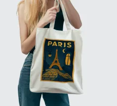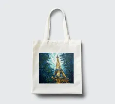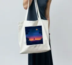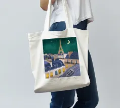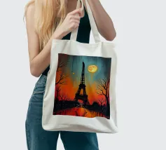 L'immagine mostra la Torre Eiffel in un cielo notturno di un blu intenso, con nuvole bianche, stelle scintillanti e una mezzaluna arancione. La torre stessa risplende nei toni caldi del giallo e dell'arancione e si staglia radiosa sullo sfondo scuro. Lo stile è chiaramente illustrativo e artistico, un misto di romanticismo sognante e colorazione espressiva. Ricorda un dipinto o un poster digitale che enfatizza l'atmosfera e lo stato d'animo piuttosto che la precisione realistica. Un gioco visivamente affascinante tra fantasia e punto di riferimento.