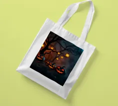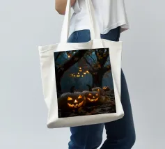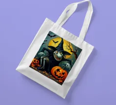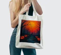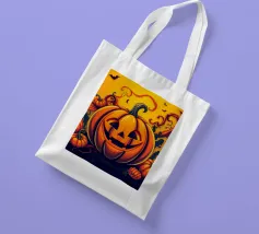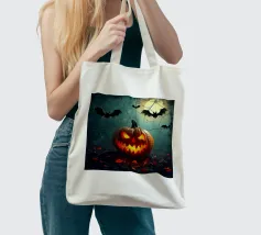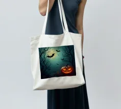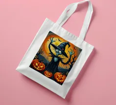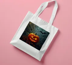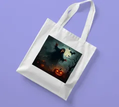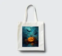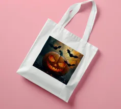 Al calare del crepuscolo, una strega in silhouette vola a cavallo della sua scopa tra i pipistrelli, con una zucca incandescente in primo piano, creando un'atmosfera incantevole.